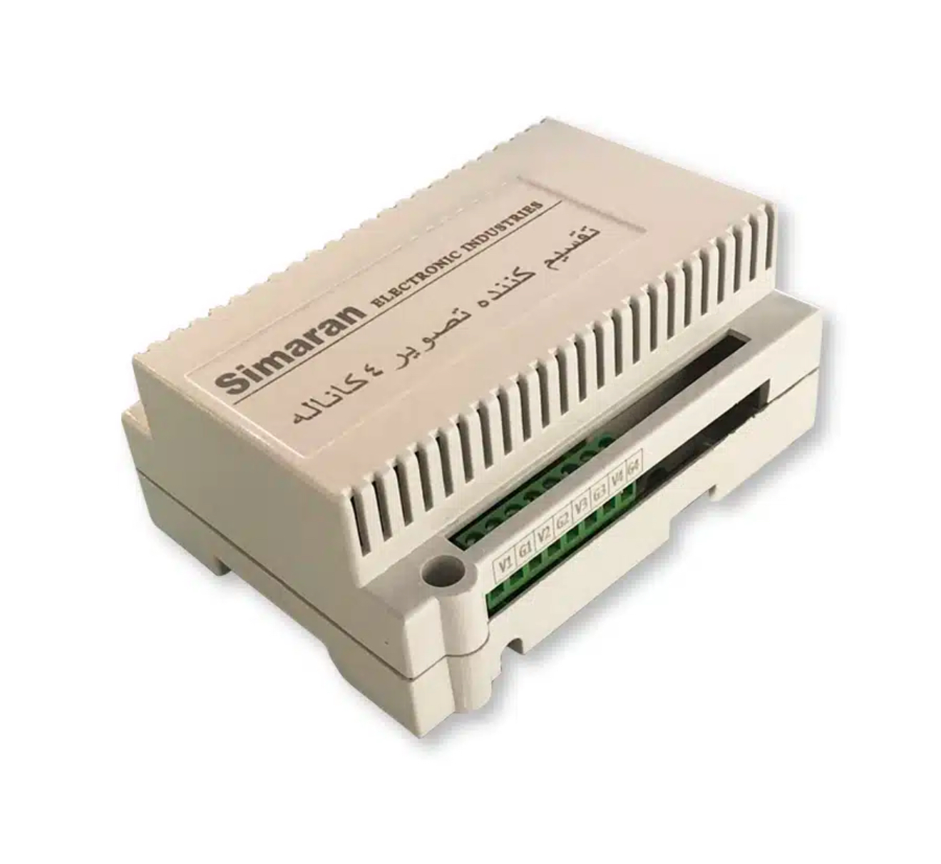 تقسیم کننده تصویر 4 کاناله : تقسیم کننده ی تصویر 4 کاناله همانطور که از نامش پیداست دارای 4 کانال خروجی می باشد. این دستگاه تصویر ورودی را به 4 تصویر با همان کیفیت اصلی ایجاد می کند. با این روش می توان توزیع سیگنال تصویر در قسمت های مختلف ساختمان را متعادل کرد. همچنین در ساختمان های چند رایزری بسیار کاربردی است و مورد استفاده قرار می گیرد. در این تقسیم کننده ارتباط میان پنل و دیکدر و تقسیم کننده تصویر باید توسط کابل کواکسیل برقرار شود. گارانتی و خدمات پس از فروش : این محصول همانند دیگر محصولات تولید شده این شرکت دارای 30 ماه گارانتی و خدمات پس از فروش می باشد.